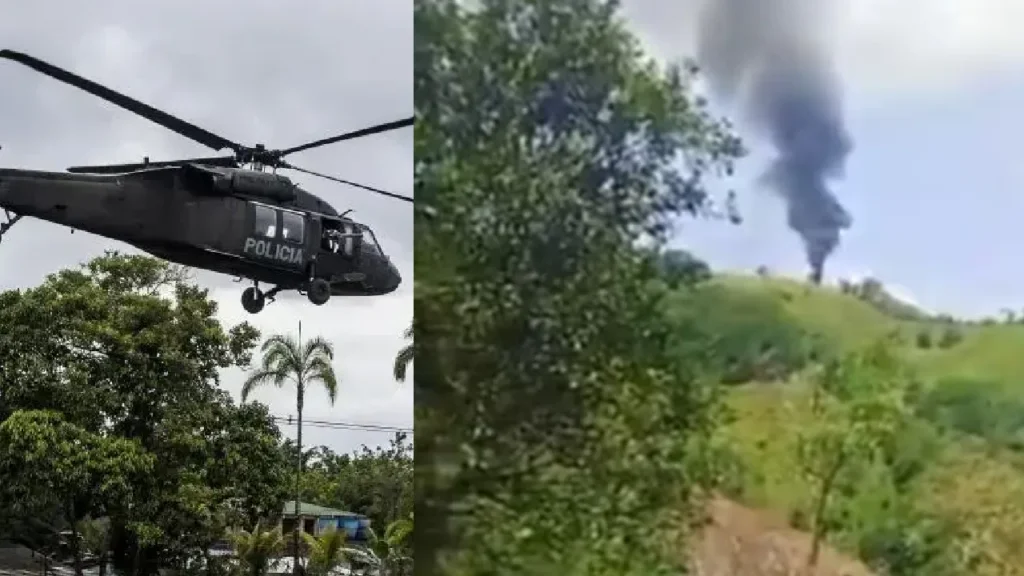 Un helicóptero de la Policía de Colombia fue derrumbado con un dron, mientras la aeronave realizaba un sobrevuelo para proteger a agentes que trabajaban en un operativo contra narcotraficantes.