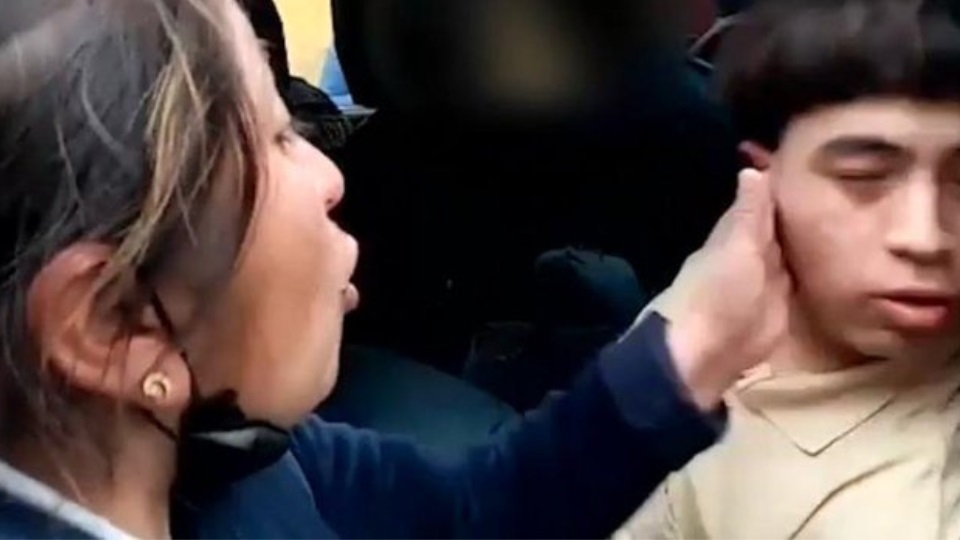 En un video que circula en redes sociales se observa a la mujer dar una cachetada a su hijo por la manera en que actuó frente a los agentes de policía.