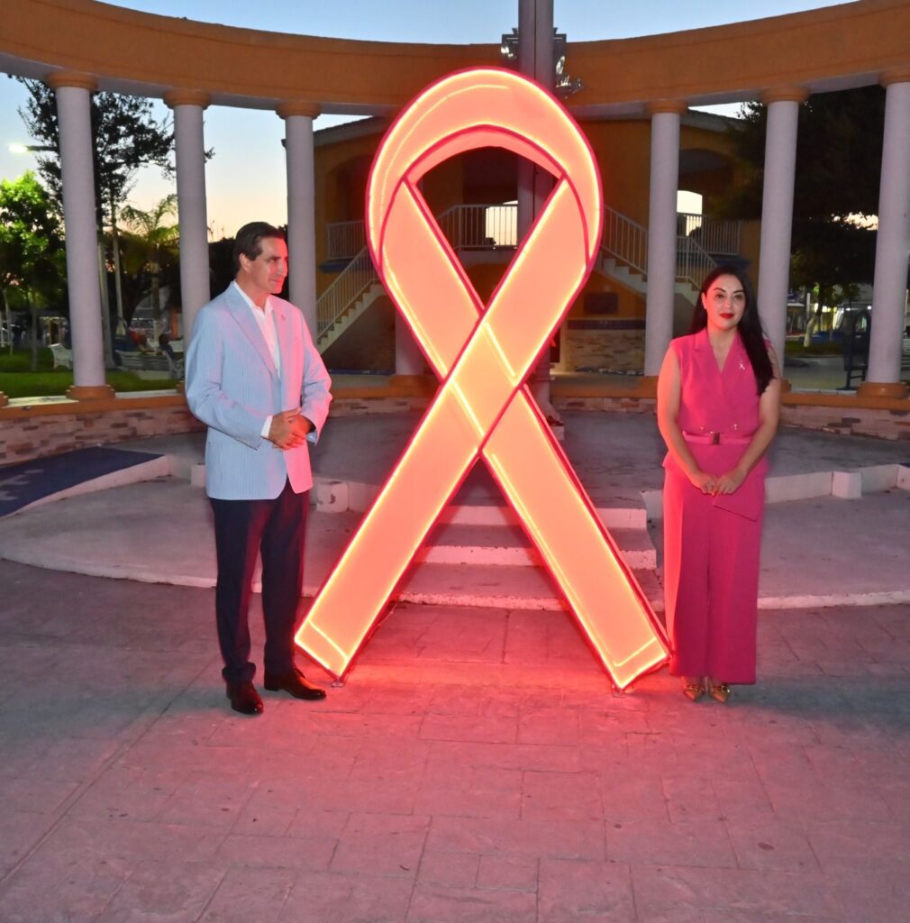 Cd. Valle Hermoso Tamaulipas.- La presidenta del Sistema DIF Valle Hermoso, Dra. Nadia Atienzo Rodríguez, encabezo , frente a la presidencia municipal, el encendido del lazo rosa, símbolo de la lucha y la esperanza contra el cáncer de mama.