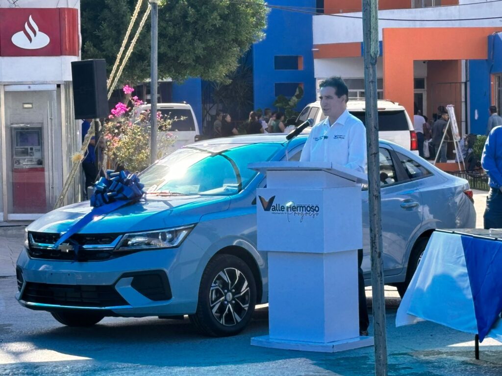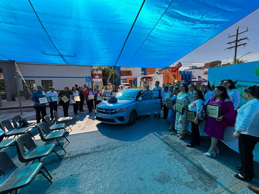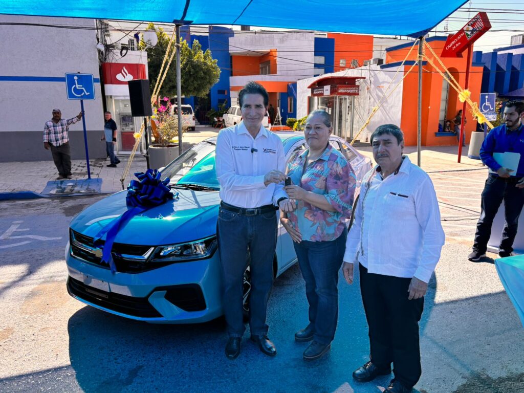 La afortunada ganadora del primer premio un AVEO 2025 último modelo fue la maestra Alma Dinorah García Solís, premio que fue entregado por el presidente municipal Dr. Alberto Alanís Villarreal.