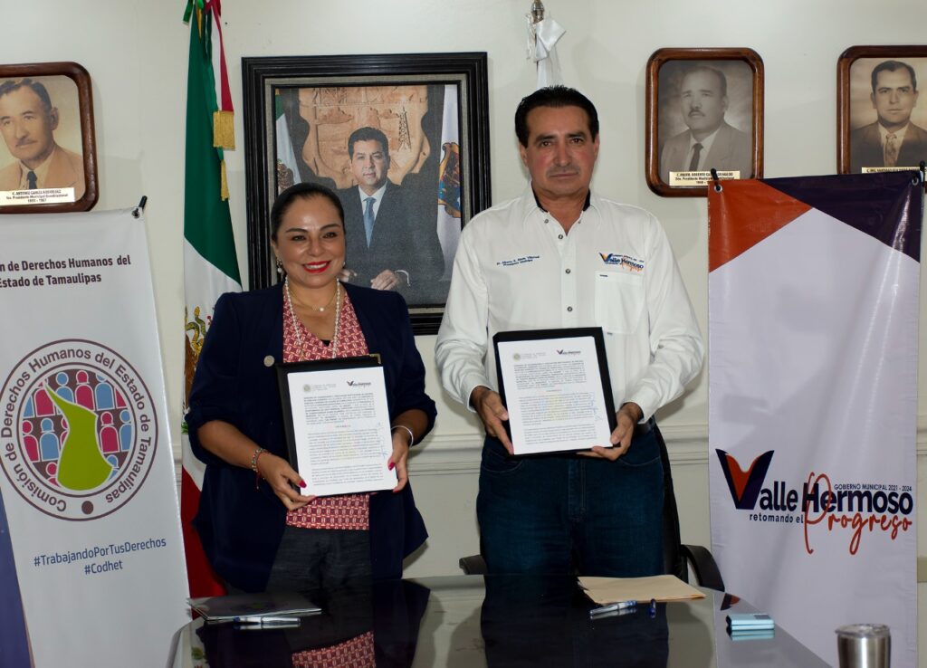 Cd. Valle Hermoso, Tam. – El día de hoy, en la sala de cabildo, se firmó un convenio de colaboración y vinculación institucional, contando con la presencia del alcalde, Dr. Alberto Alanís Villarreal, de la Presidenta del Sistema DIF Valle Hermoso, Dra. Nadia Alicia Atienzo Rodríguez, así como de la Presidenta de la Comisión de Derechos Humanos del Estado de Tamaulipas, Lic. Olivia Lemus.