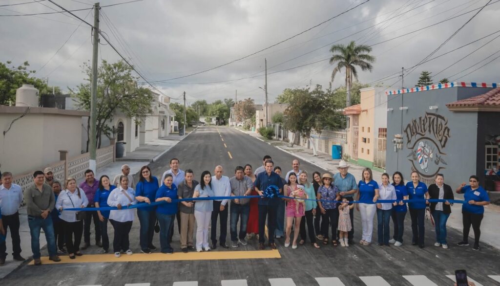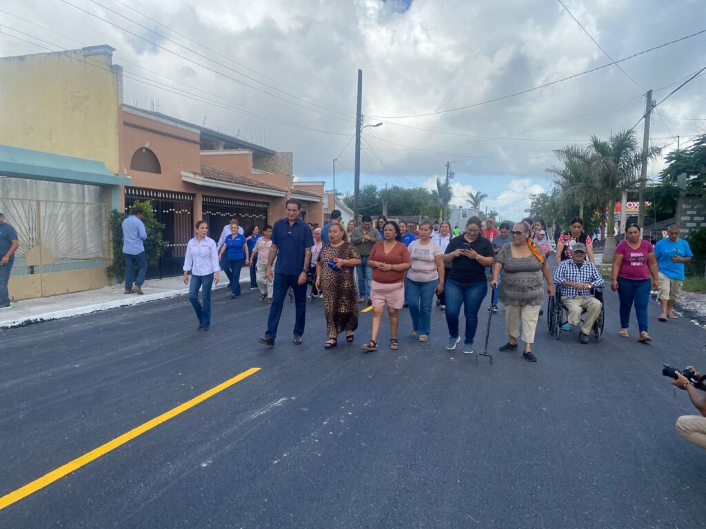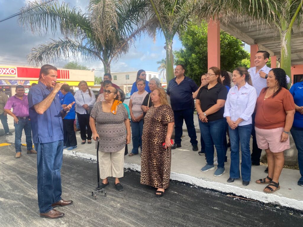 En ese sentido, el Presidente Municipal primeramente acompañado por integrantes de su Cabildo, equipo de trabajo y vecinos, realizo la inauguración de la obra de pavimentación de la calle primero de Mayo entre América y Rio Bravo.
