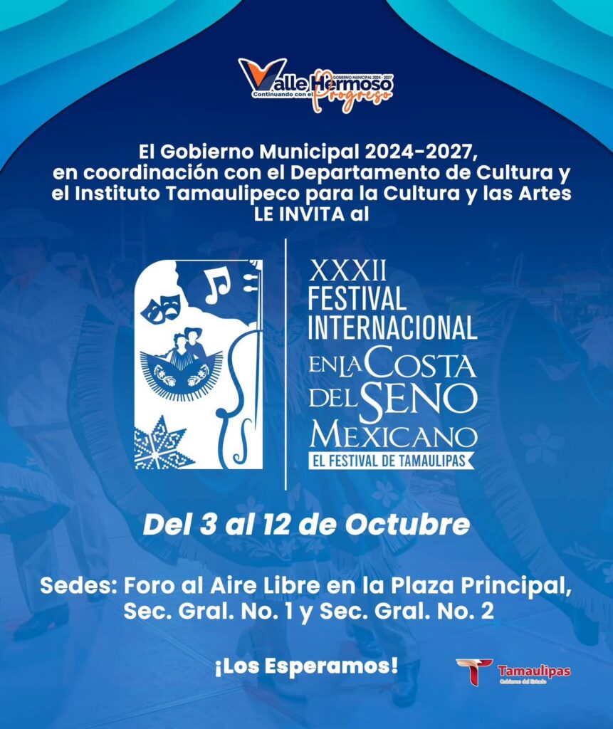 El Gobierno Municipal 2024–2027, que preside el Dr. Alberto Alanis Villarreal, en coordinación con el Departamento de Cultura y el Instituto Tamaulipeco para la Cultura y las Artes les invita al XXXII Festival Internacional en la Costa del Seno Mexicano.