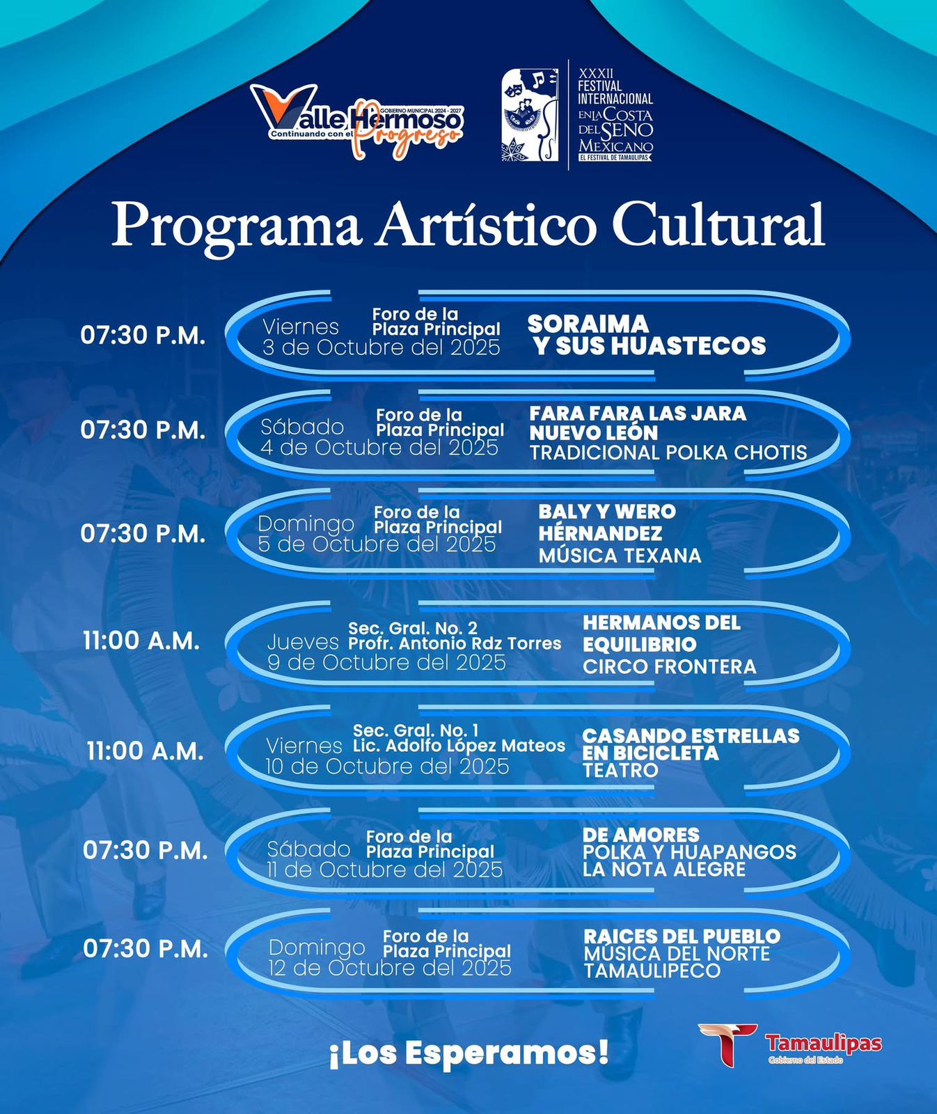 El Gobierno Municipal 2024–2027, que preside el Dr. Alberto Alanis Villarreal, en coordinación con el Departamento de Cultura y el Instituto Tamaulipeco para la Cultura y las Artes les invita al XXXII Festival Internacional en la Costa del Seno Mexicano.