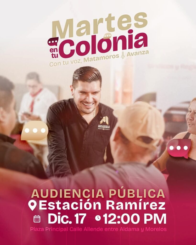 Matamoros, Tamaulipas.- El alcalde Alberto Granados Fávila extiende una cordial invitación a todos los ciudadanos para asistir a la próxima jornada de «Martes en tu Colonia», que se llevará a cabo este martes 17 de diciembre en la comunidad de Estación Ramírez.