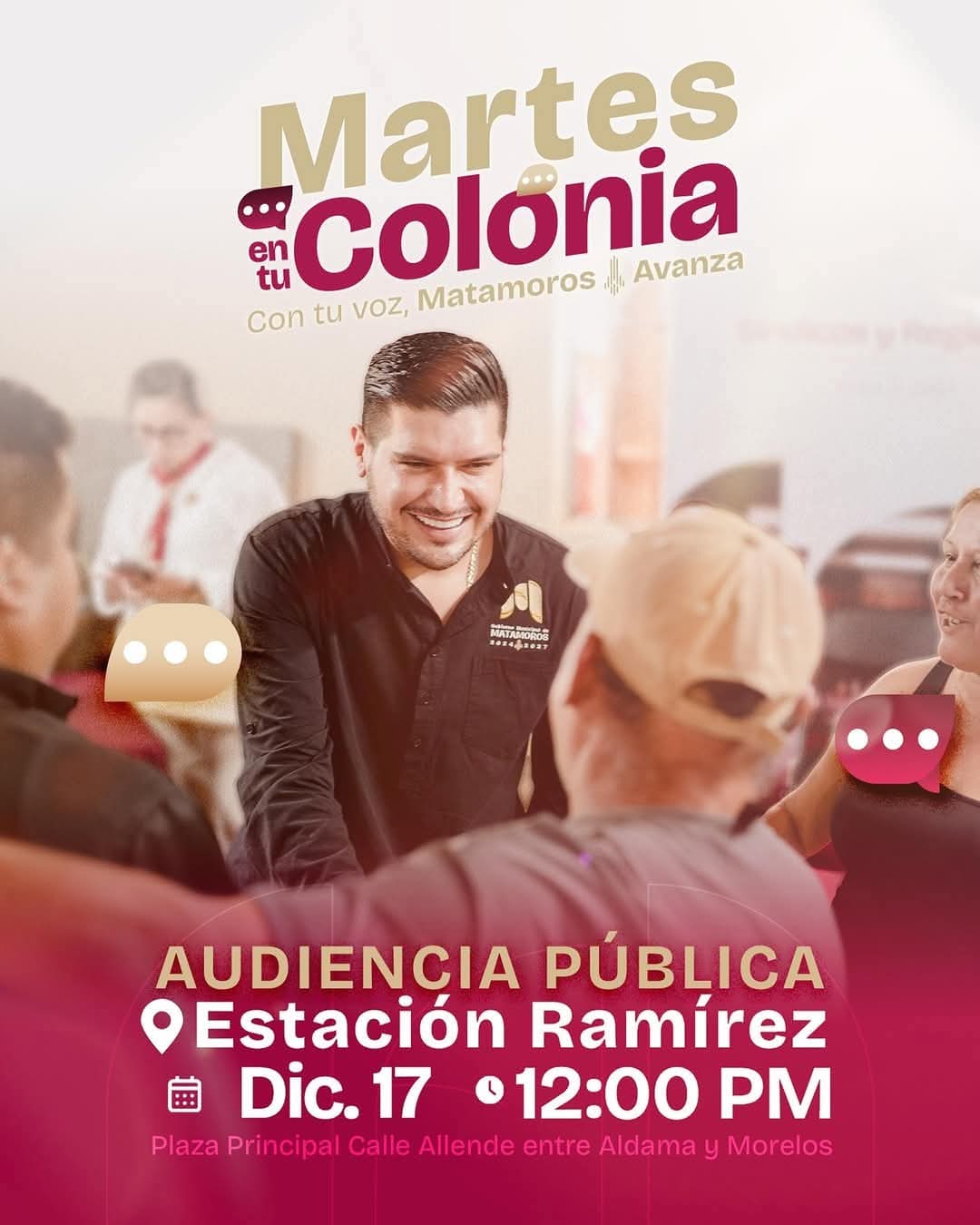 Matamoros, Tamaulipas.- El alcalde Alberto Granados Fávila extiende una cordial invitación a todos los ciudadanos para asistir a la próxima jornada de «Martes en tu Colonia», que se llevará a cabo este martes 17 de diciembre en la comunidad de Estación Ramírez.