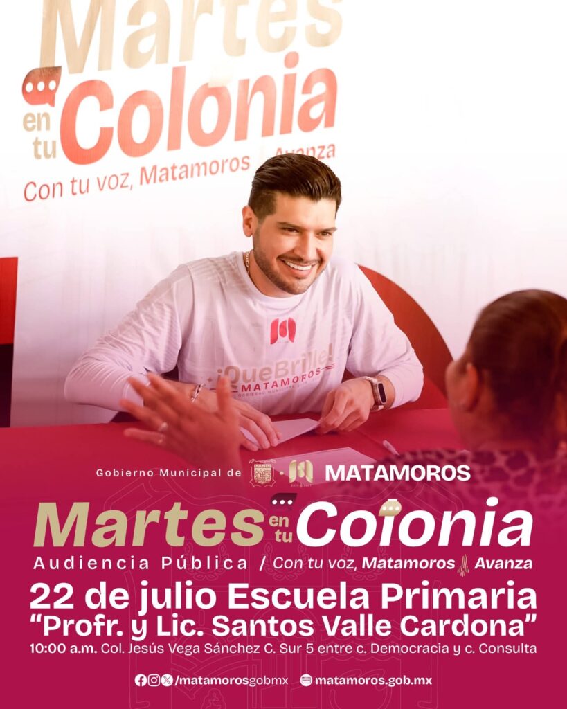 H. Matamoros, Tamaulipas.- Este martes 22 de julio, el Gobierno de Matamoros llevará la audiencia pública «Martes en tu Colonia» a la Escuela Primaria «Profr. y Lic. Santos Valle Cardona», ubicada en la Colonia Jesús Vega Sánchez.