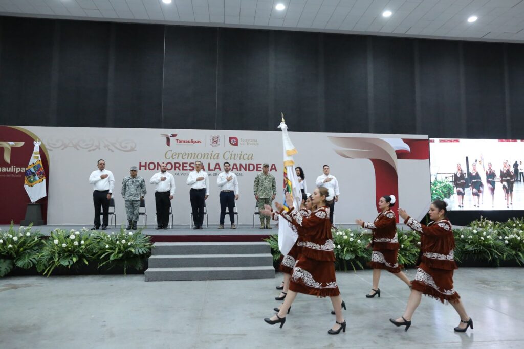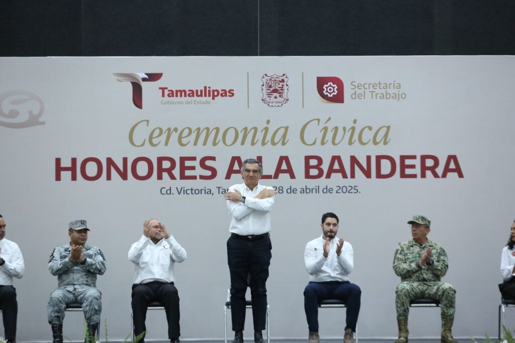 Durante la ceremonia de honores a la bandera, realizada en el Polyforum Rodolfo Torre Cantú, el mandatario destacó los avances en materia laboral impulsados en los últimos años en México, especialmente durante la administración del presidente Andrés Manuel López Obrador.