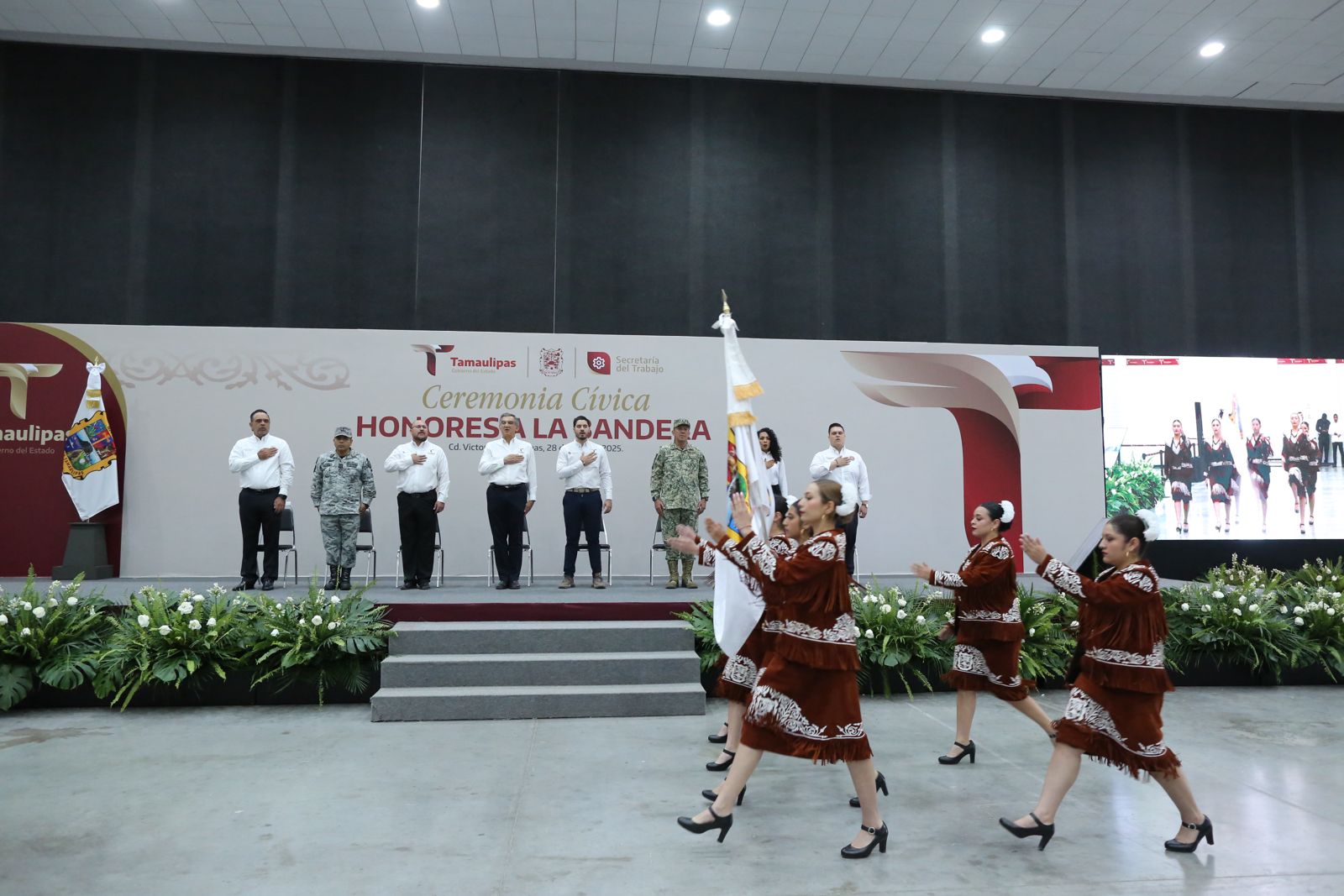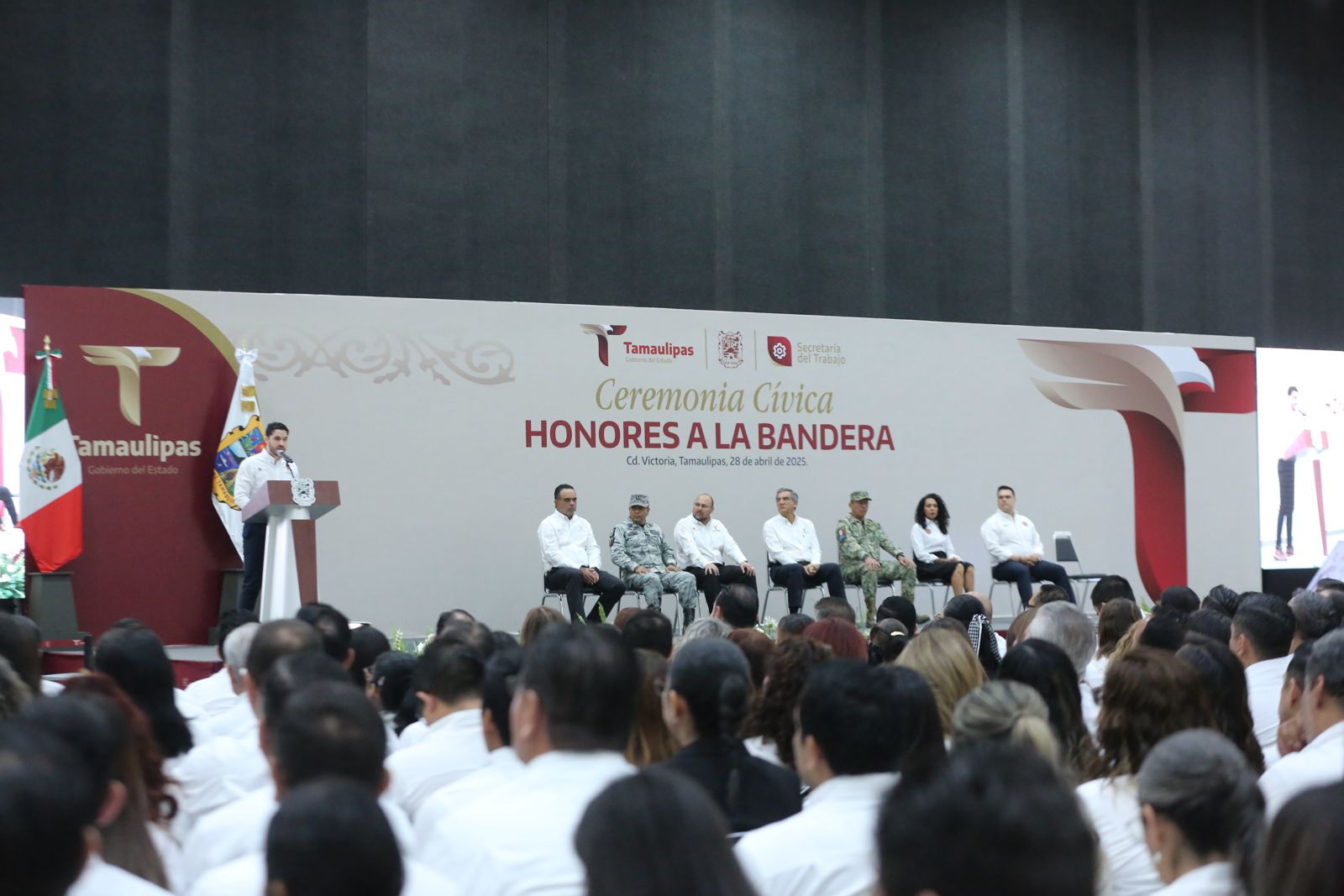 Durante la ceremonia de honores a la bandera, realizada en el Polyforum Rodolfo Torre Cantú, el mandatario destacó los avances en materia laboral impulsados en los últimos años en México, especialmente durante la administración del presidente Andrés Manuel López Obrador.