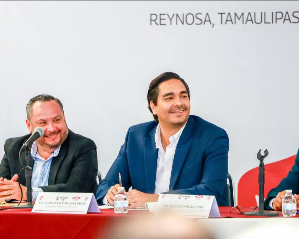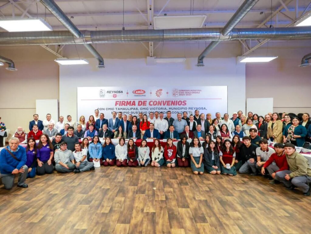 El Presidente Municipal Carlos Peña Ortiz; el Presidente Estatal de la Cámara Mexicana de la Industria de la Construcción, CMIC, Pablo Eduardo Haro Panduro; Olegario Muñiz Cura, Responsable de la Oficina Estatal de la DGETI, y la Alcaldesa de Diaz Ordaz, Tamaulipas, Nataly García Díaz, encabezaron la Firma de Convenios CMIC-DGETI-Ayuntamientos de Reynosa y Diaz Ordaz para beneficiar a más de 2 Mil estudiantes.
