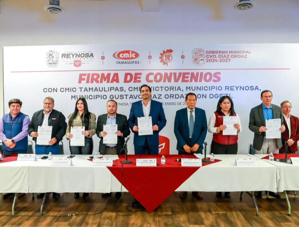 El convenio de la CMIC con DGETI y Ayuntamientos de Reynosa y Díaz Ordaz beneficiará a más de 2 Mil estudiantes de la carrera Técnico en Construcción, al conseguir más espacios para sus prácticas profesionales, servicio social, asesorías, estadías y capacitación.