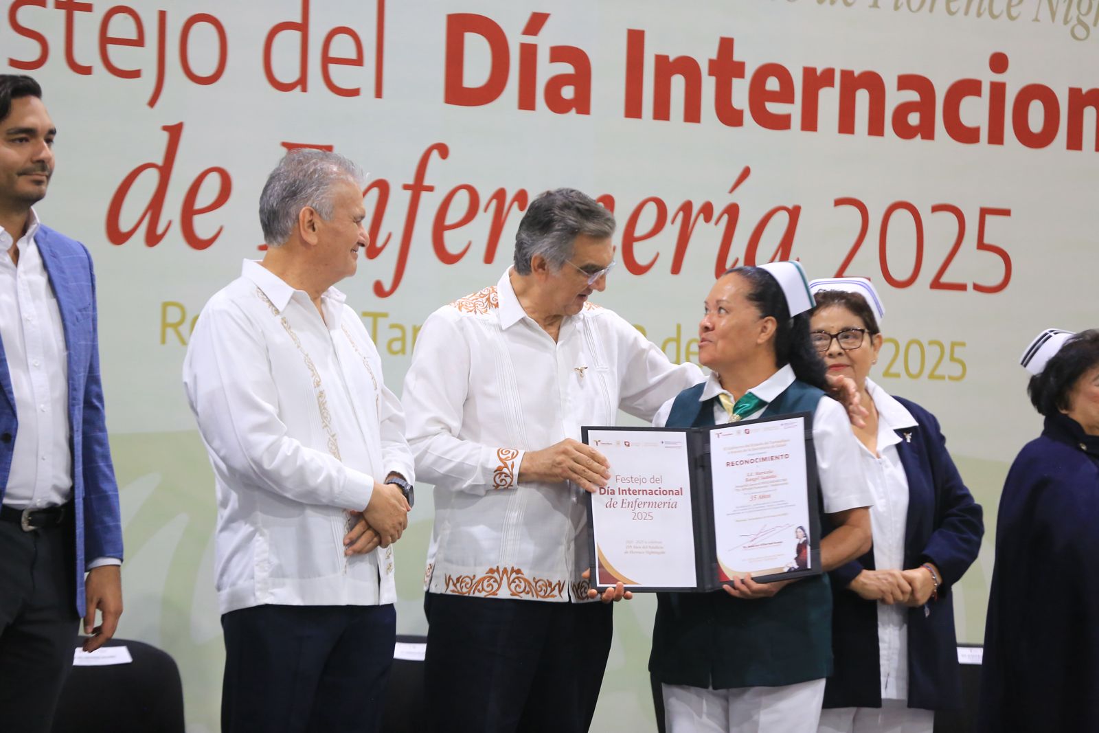 Por su parte, el secretario de Salud, Vicente Joel Hernández Navarro, afirmó que este reconocimiento es un compromiso cumplido del gobernador Américo Villarreal y un homenaje a la vocación de servicio, la trayectoria, el liderazgo de las y los enfermeros de Tamaulipas, «con el que día a día brindan cuidados de calidad al paciente, a su familia y a la comunidad», dijo.