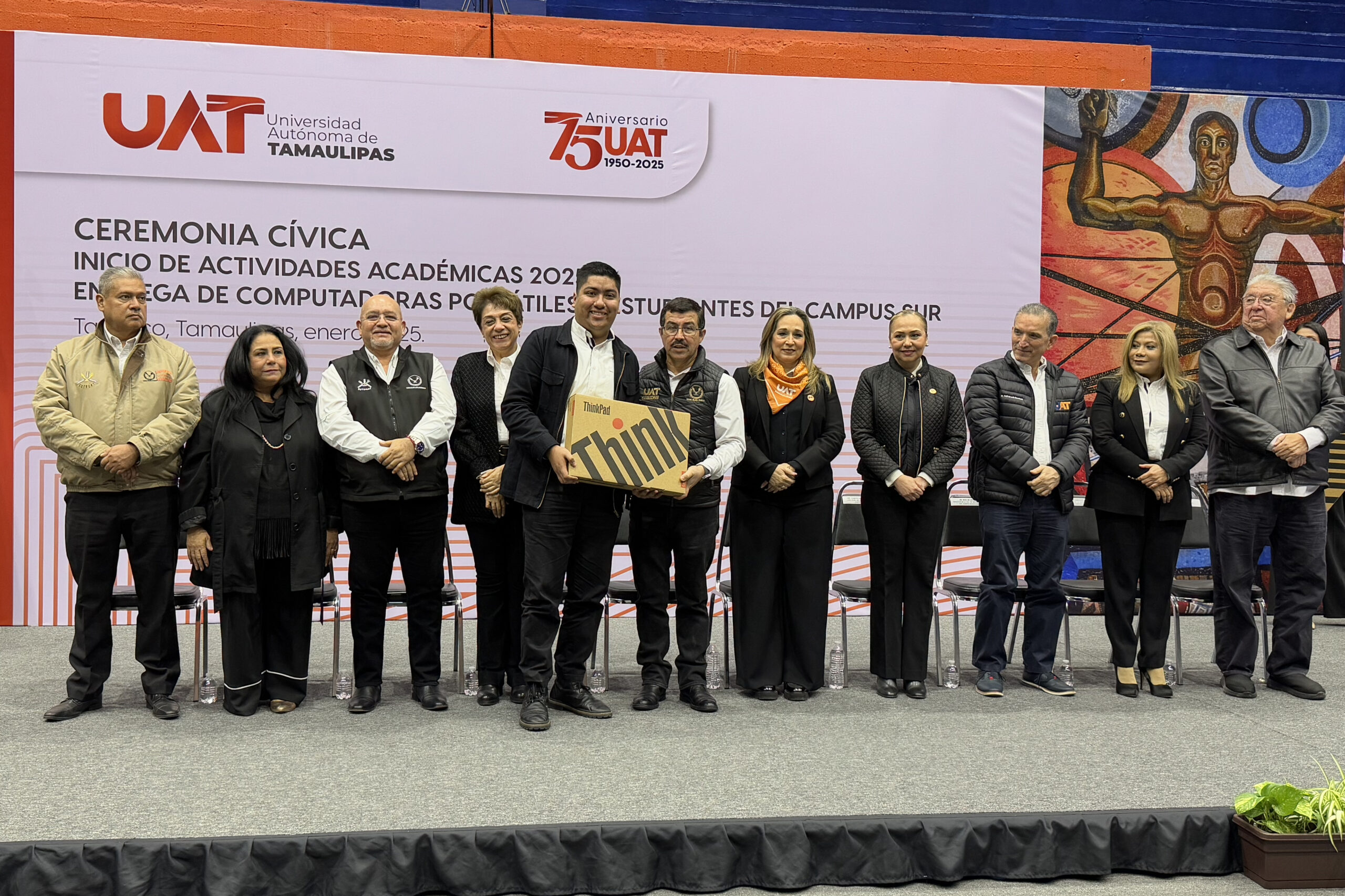 En el evento realizado en el Centro Universitario Sur, el rector estuvo acompañado de su esposa, Isolda Rendón de Anaya, presidenta de Familia UAT, y directivos de las facultades y unidades académicas, donde hizo entrega de equipo de cómputo portátil a estudiantes de este campus.