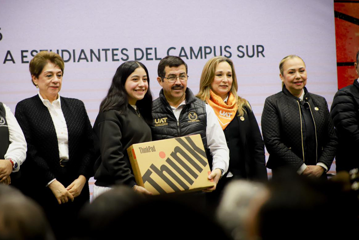 En el evento realizado en el Centro Universitario Sur, el rector estuvo acompañado de su esposa, Isolda Rendón de Anaya, presidenta de Familia UAT, y directivos de las facultades y unidades académicas, donde hizo entrega de equipo de cómputo portátil a estudiantes de este campus.