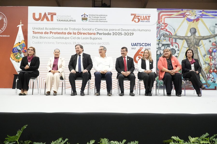 « Teniendo como testigo de honor al gobernador Américo Villarreal Anaya, el rector de la Universidad Autónoma de Tamaulipas (UAT), Dámaso Anaya Alvarado, le tomó protesta a la nueva directora de la Unidad Académica de Trabajo Social y Ciencias para el Desarrollo Humano (UATSCDH), Dra. Blanca Guadalupe Cid de León Bujanos, quien asume el cargo para el periodo 2025-2029. «