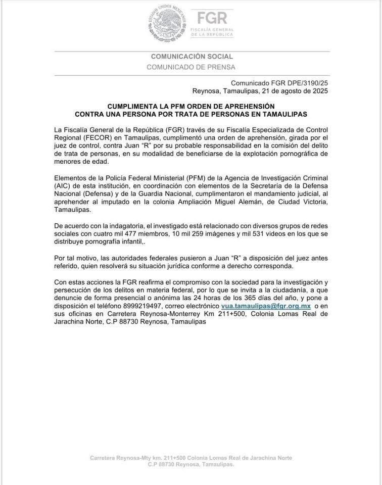 La orden de aprehensión se ejecutó en contra de Juan “R”, señalado por su probable responsabilidad en el delit0 de trat@ de personas en su modalidad de beneficiarse de la expl0tación porn0gráfic@ de men0res de edad.