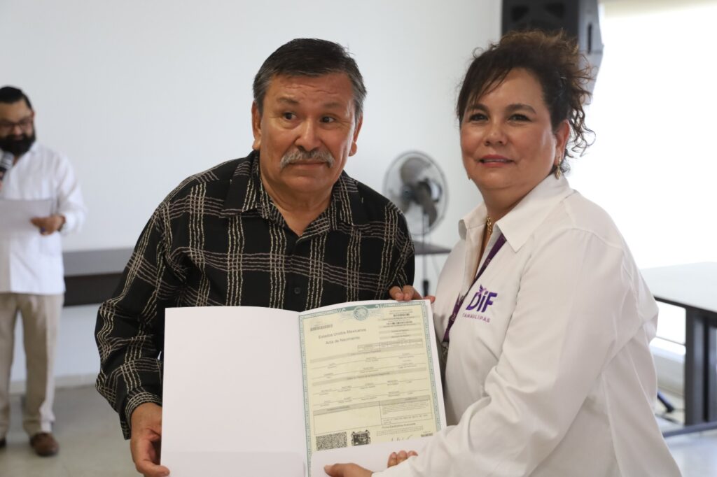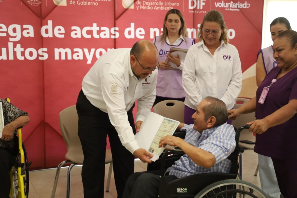 Ciudad Victoria, Tamaulipas.- Como parte de la estrategia impulsada por el gobernador del Estado, Américo Villarreal Anaya, y fortalecida por el compromiso de la presidenta del Sistema DIF Tamaulipas, doctora María Santiago de Villarreal, para asegurar que todas y todos los tamaulipecos cuenten con documentos de identidad que respalden sus derechos, el DIF estatal llevó a cabo la entrega de actas de nacimiento a adultos mayores en la Casa Hogar del Adulto Mayor.