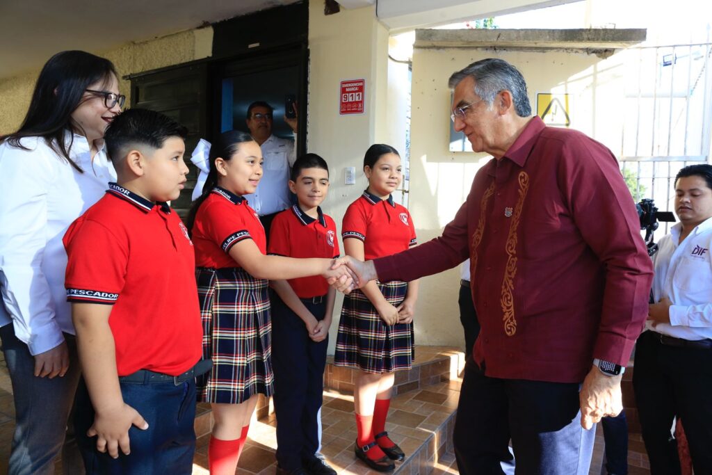 Durante el evento celebrado en la primaria Felipe Pescador, de esta ciudad, el gobernador refrendó el anuncio de la presidenta del DIF Estatal para instalar en este plantel un Desayunador Escolar y además ofreció la entrega de una “Tablet” a todas y todos los estudiantes de esta escuela.