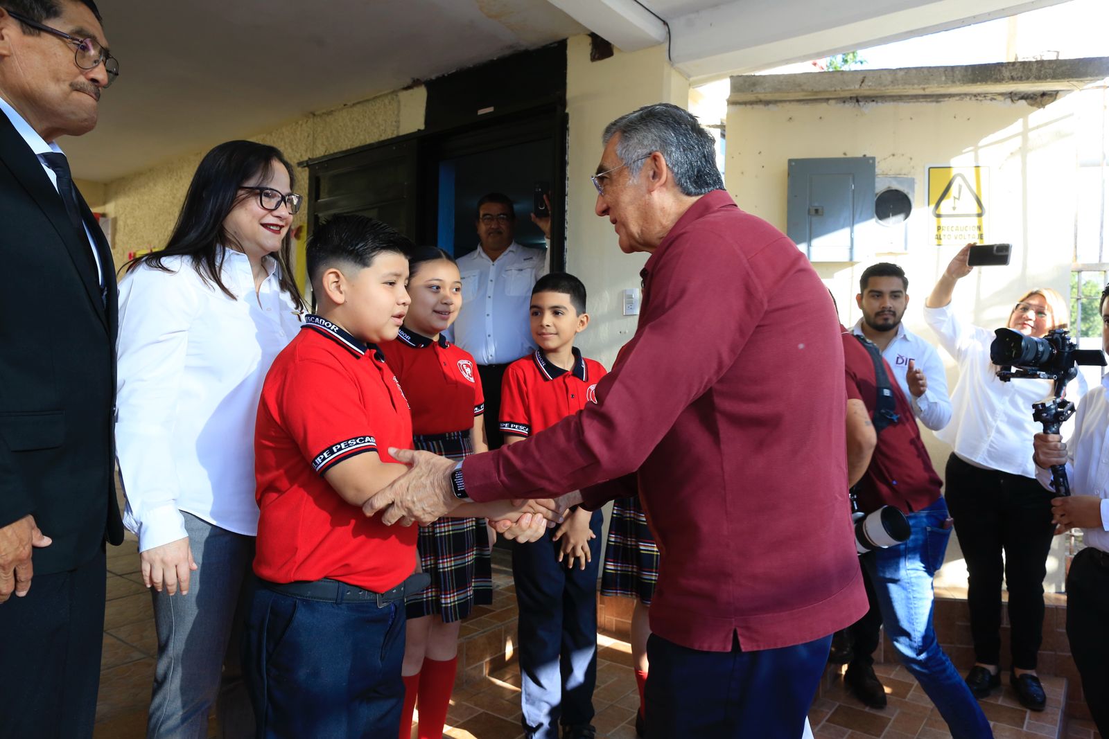 Durante el evento celebrado en la primaria Felipe Pescador, de esta ciudad, el gobernador refrendó el anuncio de la presidenta del DIF Estatal para instalar en este plantel un Desayunador Escolar y además ofreció la entrega de una “Tablet” a todas y todos los estudiantes de esta escuela.