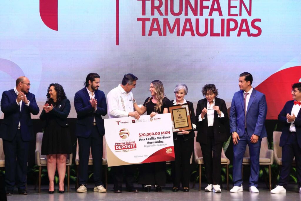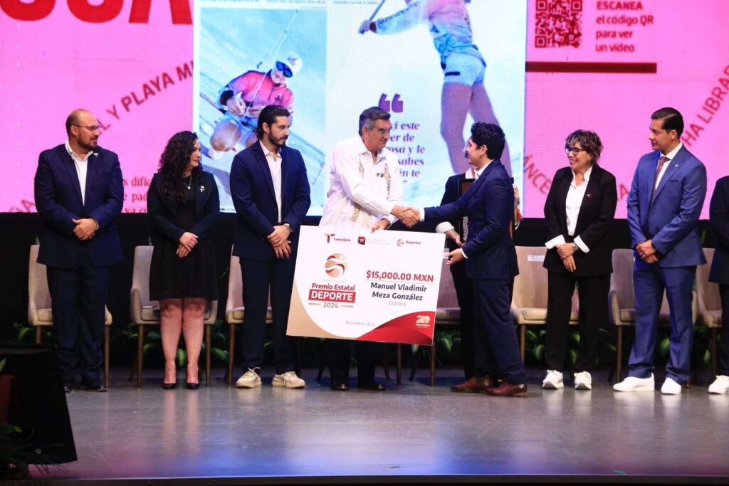 En lo referente a la entrega del Premio Estatal del Deporte, el gobernador Américo Villarreal entregó la máxima distinción del 2024 a la gimnasta de Tampico, Kimberly Salazar López, quien participó en los Juegos Olímpicos de París, además de contar en su récord con 2 medallas de oro y una de plata en el Campeonato Panamericano de Guatemala y 3 Medallas de plata en Pharaohs Cup Egipto 2024.