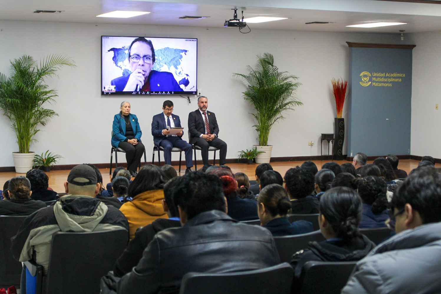 Acompañado por el subsecretario general de la UAT zona norte, Ignacio Hernández Rodríguez, y la directora de la UAM Matamoros, Yolanda Castillo Muraira, Dámaso Anaya dio la bienvenida al vicerrector de Programas de Estudios Internacionales de la UTRGV, Jaime Ortiz, quien participó de manera virtual en la ceremonia.